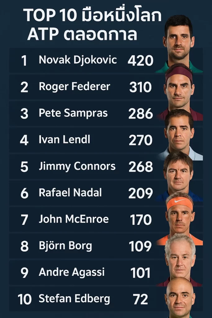 การเป็น มือหนึ่งโลก ATP Ranking ไม่ได้เกิดจากโชค แต่คือผลลัพธ์ของความสม่ำเสมอ ความแข็งแกร่งทั้งร่างกายและจิตใจ และความสามารถที่เหนือชั้นที่สุดในยุค นักกีฬาที่เคยก้าวขึ้นสู่ตำแหน่งนี้จึงกลายเป็น “ตำนาน” ที่ถูกบันทึกในหน้าประวัติศาสตร์ของวงการเทนนิส